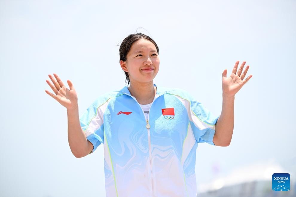 Gold medalist Li Xinxuan of China reacts during the awarding ceremony for the women's 5km final of open water swimming at the 6th Asian Beach Games in Sanya, south China's Hainan Province, April 25, 2026. (Xinhua/Bei He)