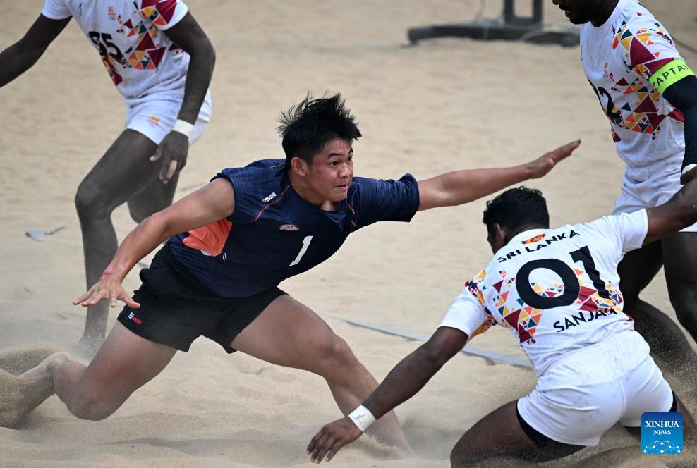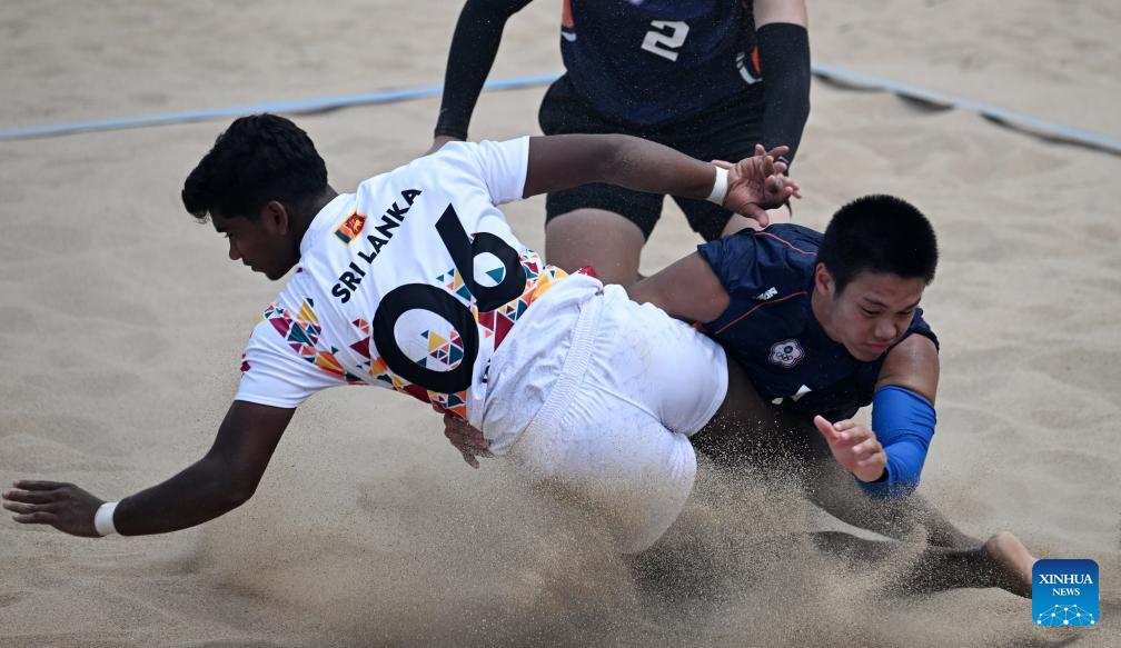 Mohammed Ansaf Mohammed Sathath (L) competes during the Beach Kabaddi Men's Team Group B match between Sri Lanka and Chinese Taipei at the 6th Asian Beach Games in Sanya, south China's Hainan Province, April 26, 2026. (Xinhua/Zhao Zishuo)