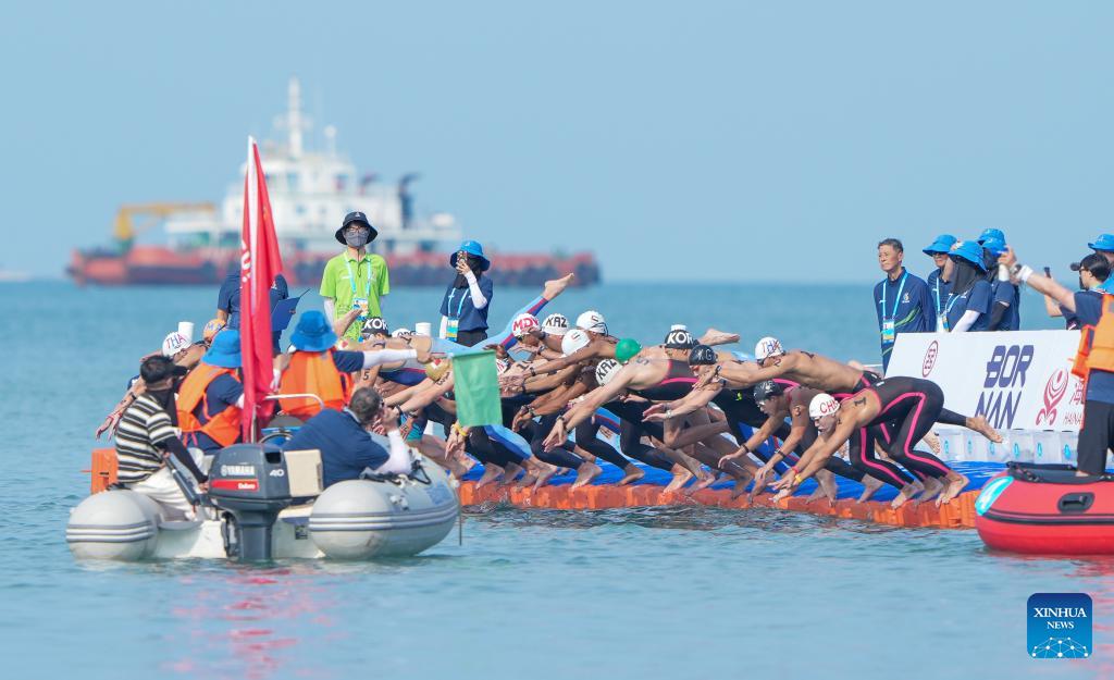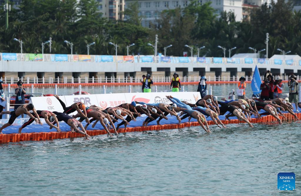 Swimmers start during the open water swimming men's 5km at the 6th Asian Beach Games in Sanya, south China's Hainan Province, April 26, 2026. (Xinhua/Bei He)