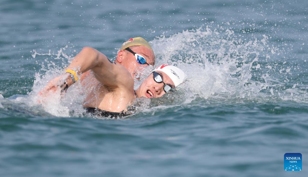 Liu Peixin (front) of China and Robert Bonsall of Bahrain compete during the open water swimming men's 5km at the 6th Asian Beach Games in Sanya, south China's Hainan Province, April 26, 2026. (Photo by Ma Zihan/Xinhua)