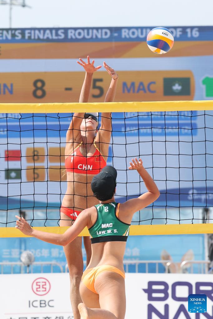 Jiang Kaiyue (R) of China competes during beach volleyball Women's Round of 16 match between Jiang Kaiyue/Dong Jie of China and Nur Atika Sari/Josephine Selvina Anasthasya Kaize of Indonesia at the 6th Asian Beach Games in Sanya, south China's Hainan Province, April 26, 2026. (Xinhua/Jigme Dorje)
