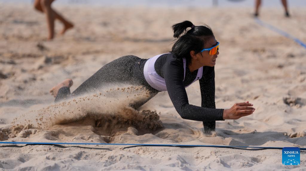 Nur Atika Sari of Indonesia competes during beach volleyball Women's Round of 16 match between Jiang Kaiyue/Dong Jie of China and Nur Atika Sari/Josephine Selvina Anasthasya Kaize of Indonesia at the 6th Asian Beach Games in Sanya, south China's Hainan Province, April 26, 2026. (Xinhua/Jigme Dorje)