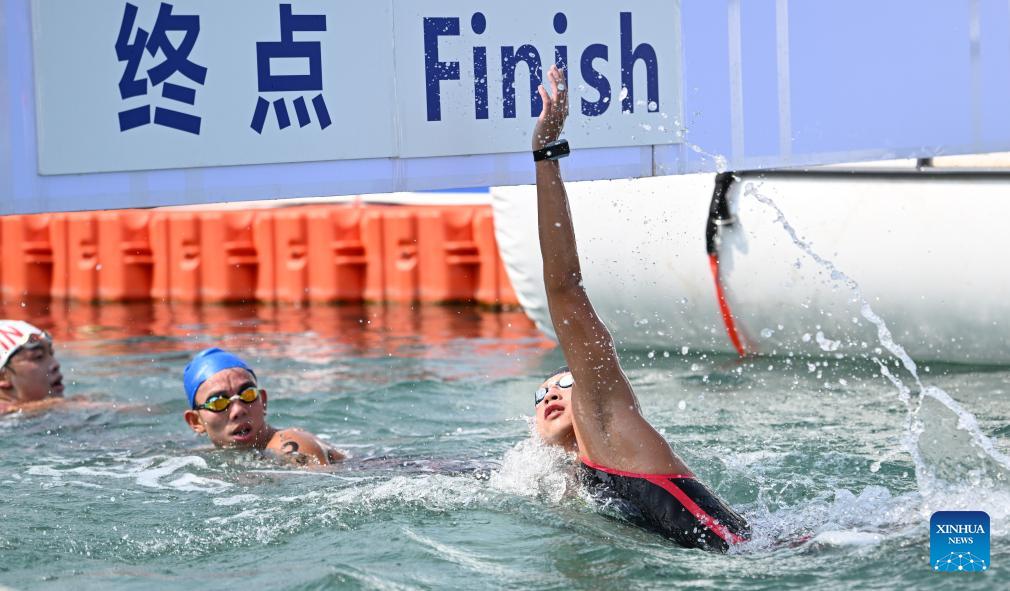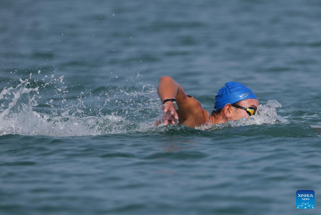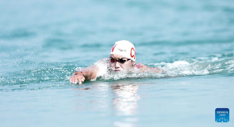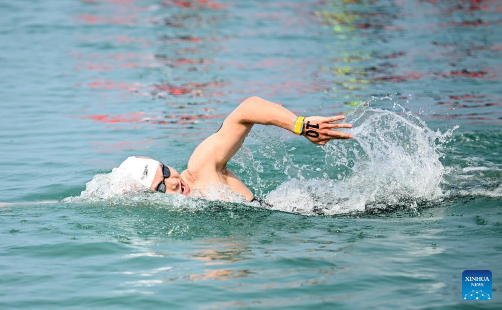 Zhang Ziyang of China competes during the open water swimming men's 5km at the 6th Asian Beach Games in Sanya, south China's Hainan Province, April 26, 2026. (Xinhua/Bei He)