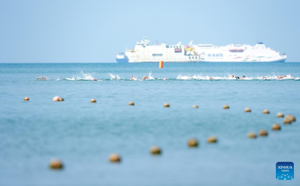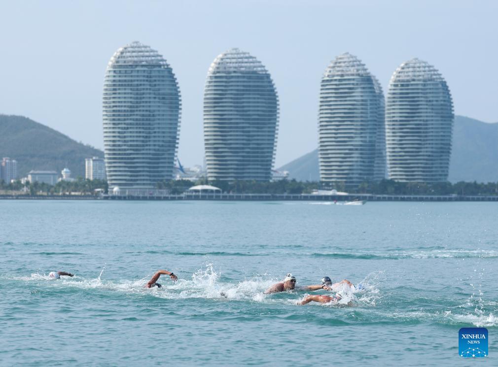 Swimmers compete during the open water swimming men's 5km at the 6th Asian Beach Games in Sanya, south China's Hainan Province, April 26, 2026. (Xinhua/Bei He)