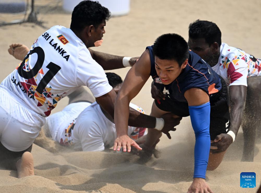 Chuang Bing-Xuan (C, front) of Chinese Taipei competes during the Beach Kabaddi Men's Team Group B match between Sri Lanka and Chinese Taipei at the 6th Asian Beach Games in Sanya, south China's Hainan Province, April 26, 2026. (Xinhua/Zhao Zishuo)