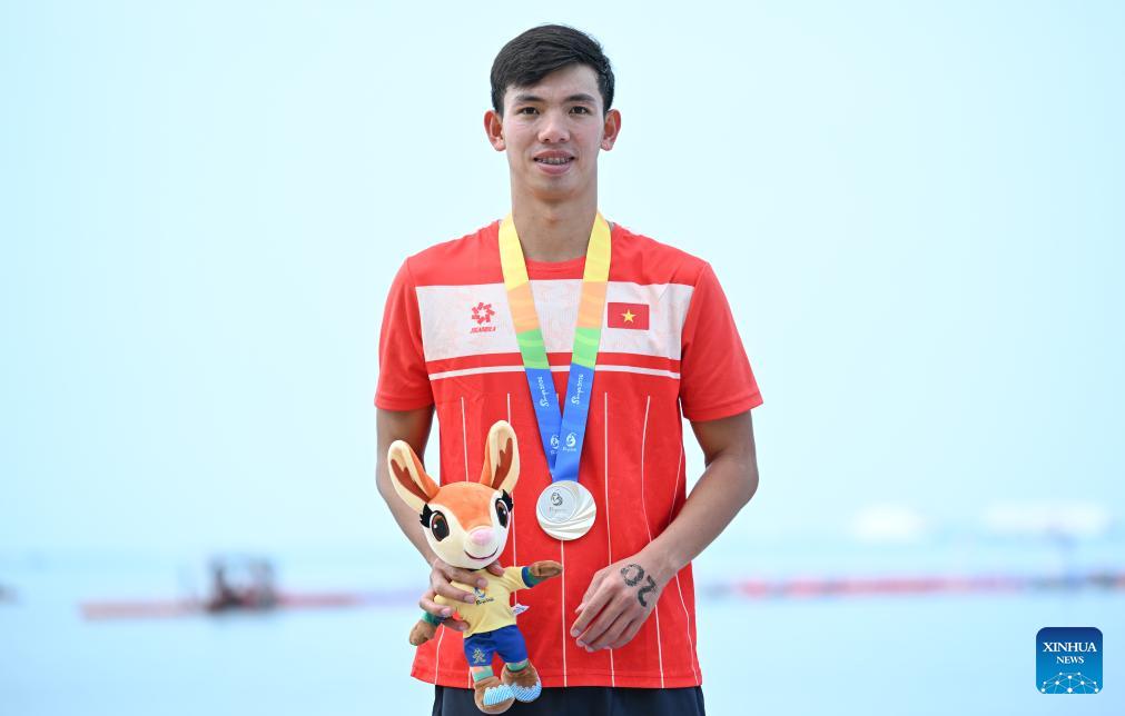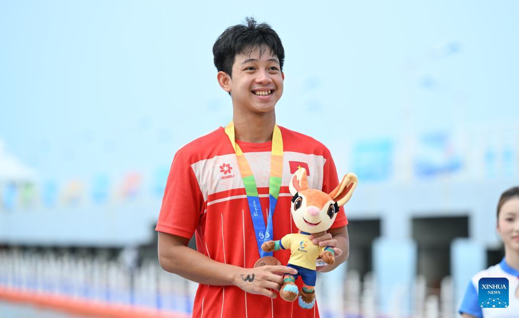 Silver medalist Nguyen Huy Hoang of Vietnam poses for photos during the awarding ceremony of the open water swimming men's 5km at the 6th Asian Beach Games in Sanya, south China's Hainan Province, April 26, 2026. (Xinhua/Bei He)