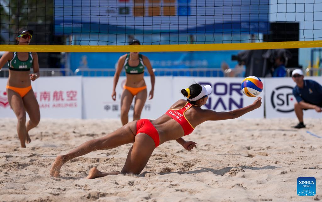 Zhou Mingli (front) of China saves the ball during beach volleyball Women's Round of 16 match between Kadeliye Halaiti/Zhou Mingli of China and Leong On Ieng/Law Weng Sam of China's Macao at the 6th Asian Beach Games in Sanya, south China's Hainan Province, April 26, 2026. (Xinhua/Jigme Dorje)