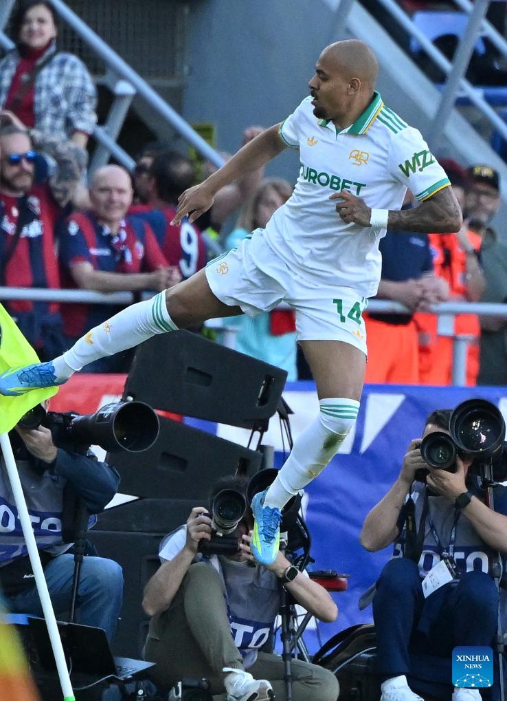 Roma's Donyell Malen celebrates his goal during a Serie A football match between Roma and Bologna in Bologna, Italy, April 25, 2026. (Photo by Alberto Lingria/Xinhua)