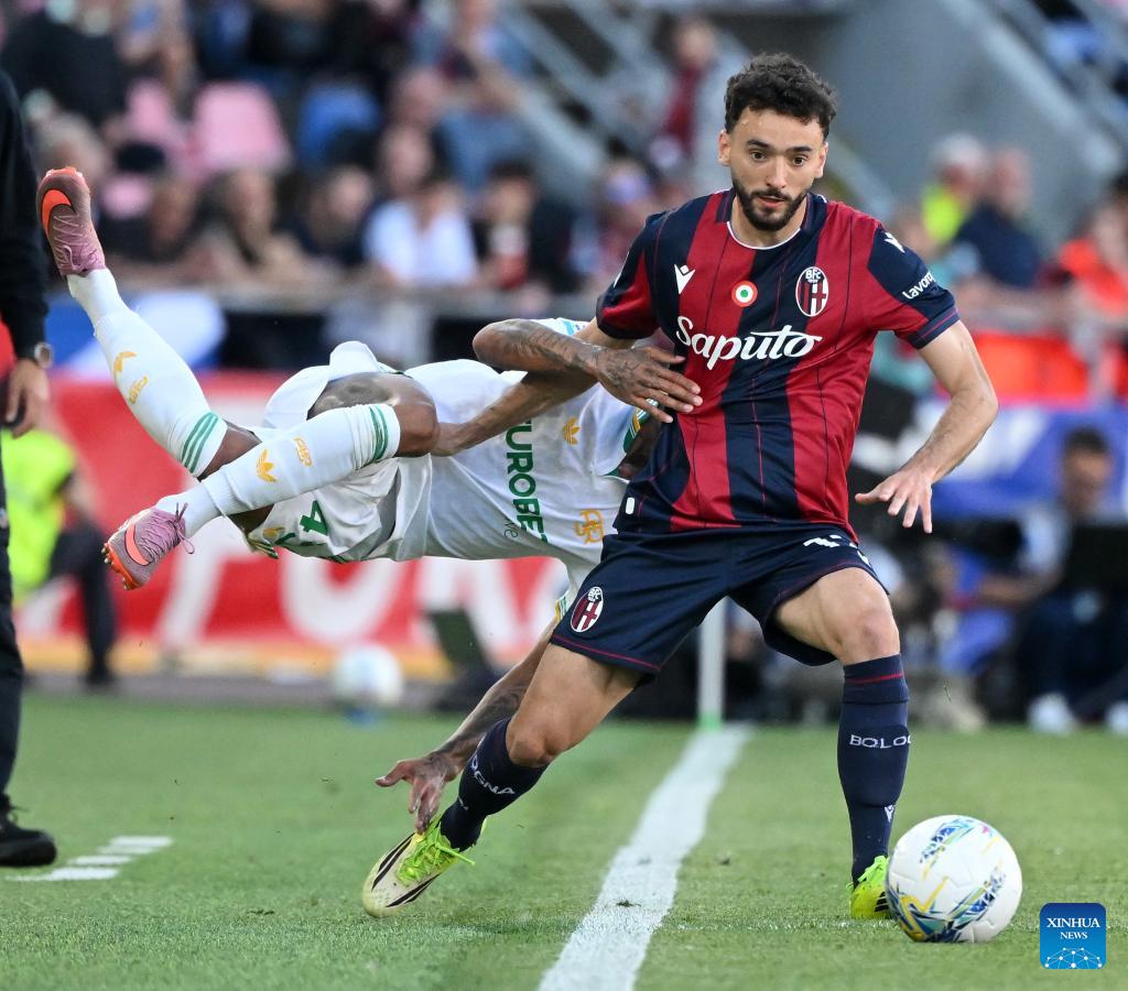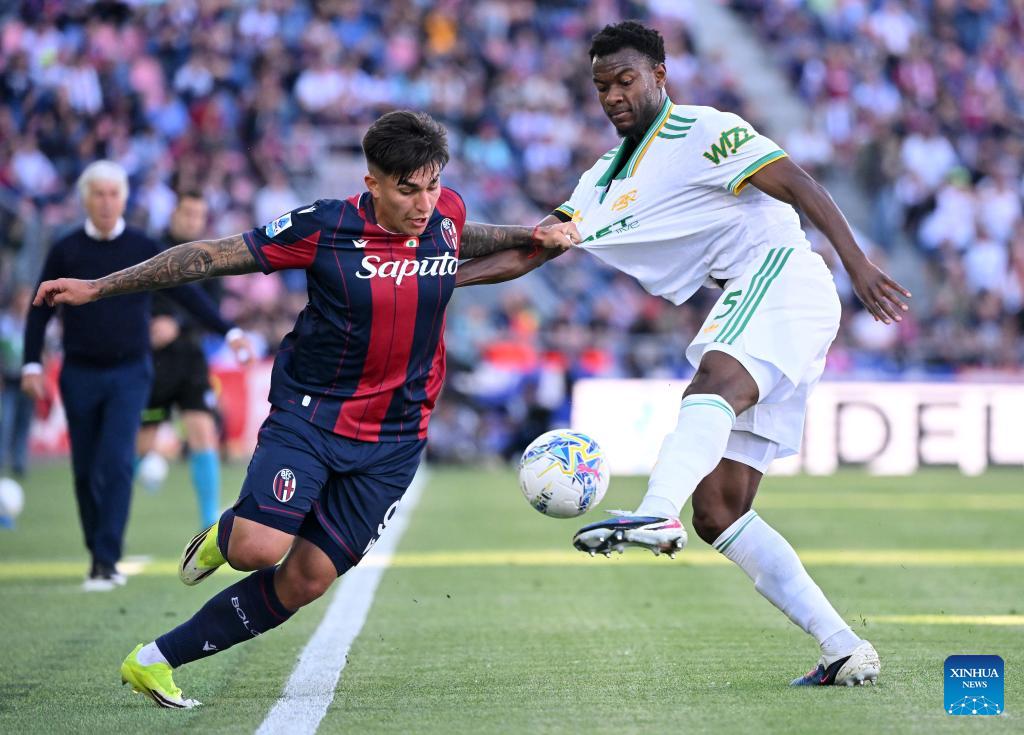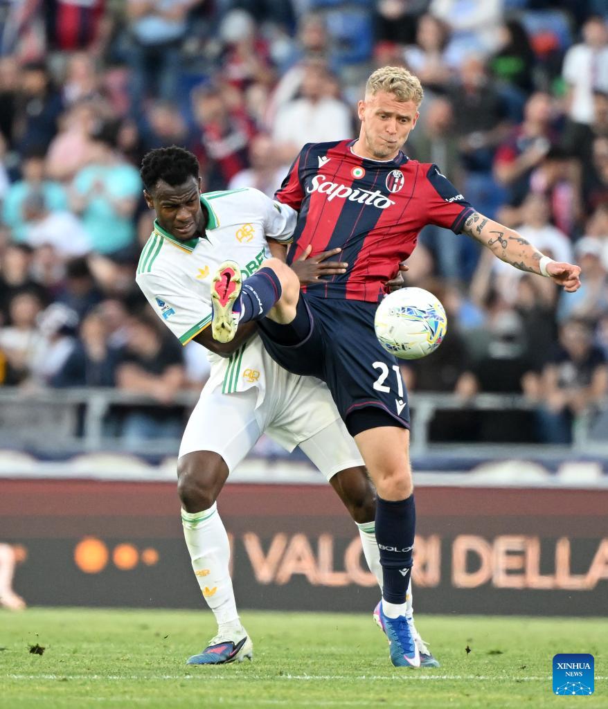 Roma's Nicolo Pisilli (R) vies with Bologna's Joao Mario during a Serie A football match between Roma and Bologna in Bologna, Italy, April 25, 2026. (Photo by Alberto Lingria/Xinhua)