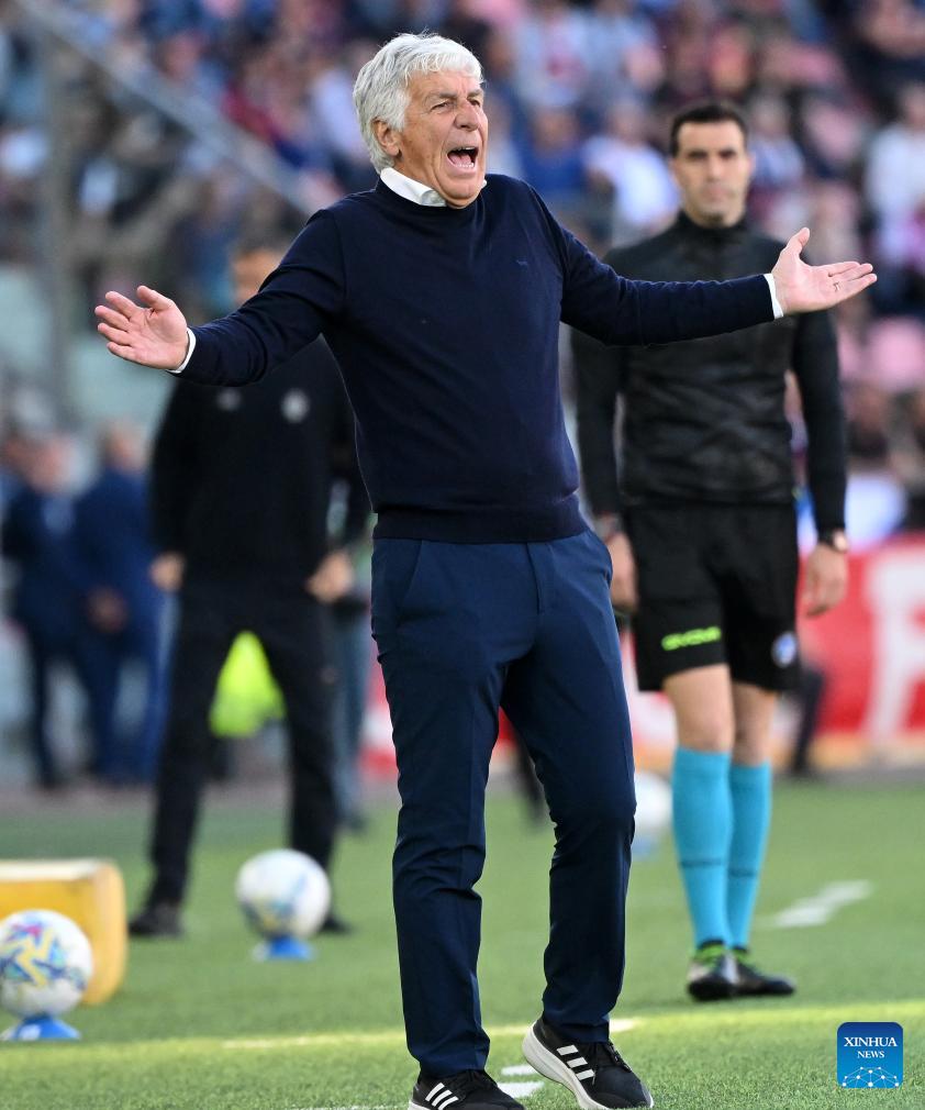 Roma's head coach Giampiero Gasperini gestures during a Serie A football match between Roma and Bologna in Bologna, Italy, April 25, 2026. (Photo by Alberto Lingria/Xinhua)