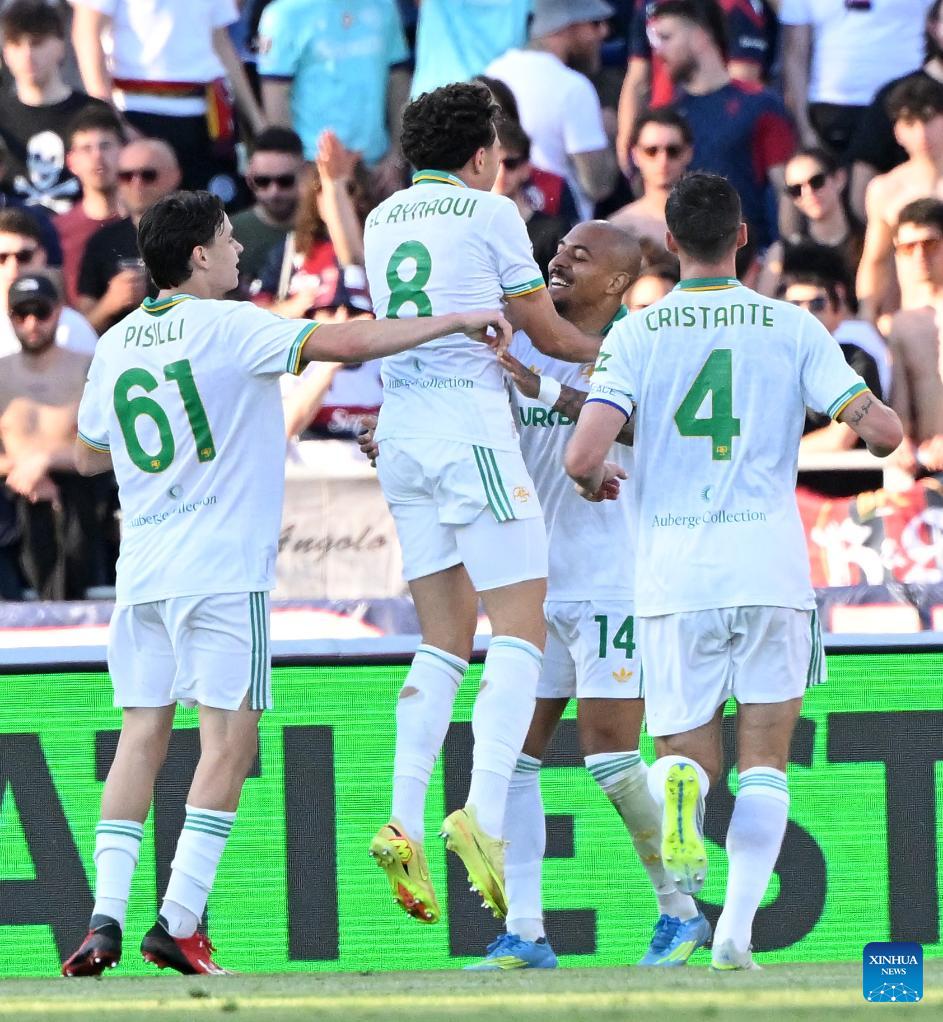 Roma's Neil El Aynaoui (2nd L) celebrates his goal with teammates during a Serie A football match between Roma and Bologna in Bologna, Italy, April 25, 2026. (Photo by Alberto Lingria/Xinhua)