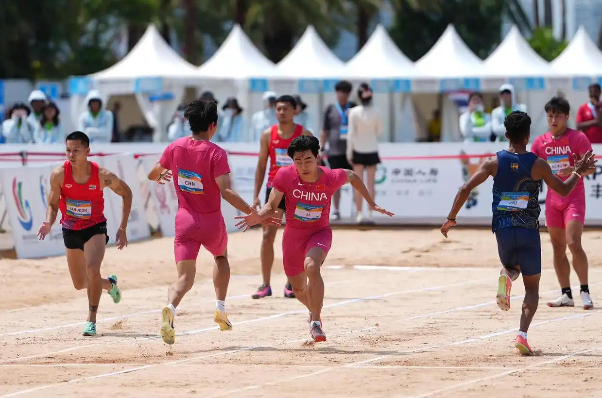 In the final event of the beach athletics program, Chinese sprinters Huang Youchao, Li Mengyuan, Wang Xinkai and Ailikuti Yishake crossed the line first in 26.06 seconds. Thailand took silver in 26.68, with Sri Lanka third in 27.57.