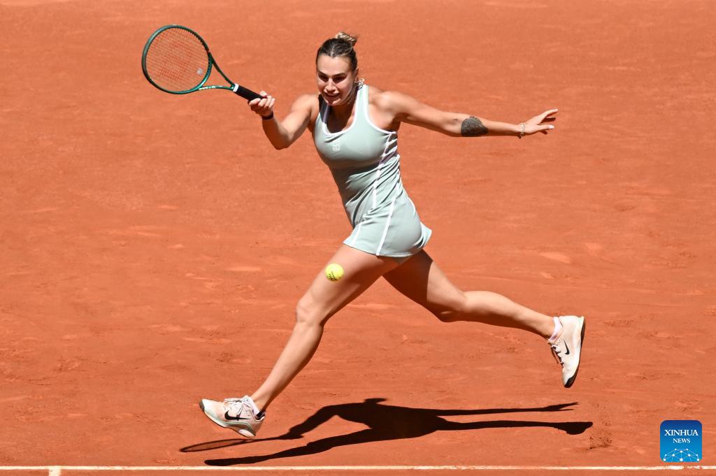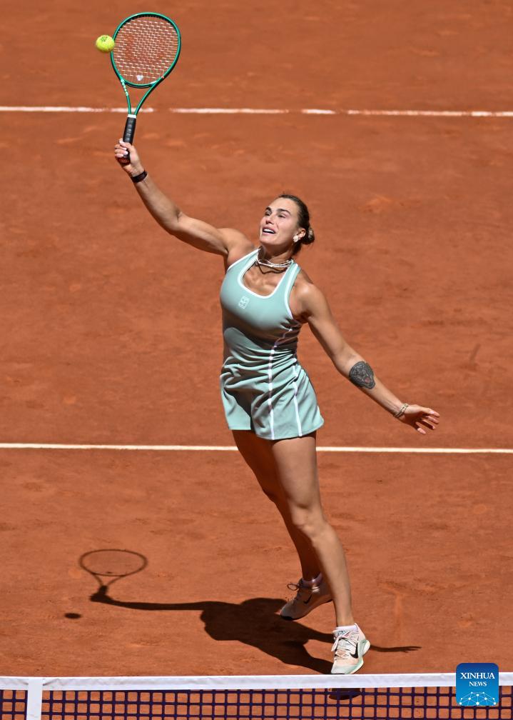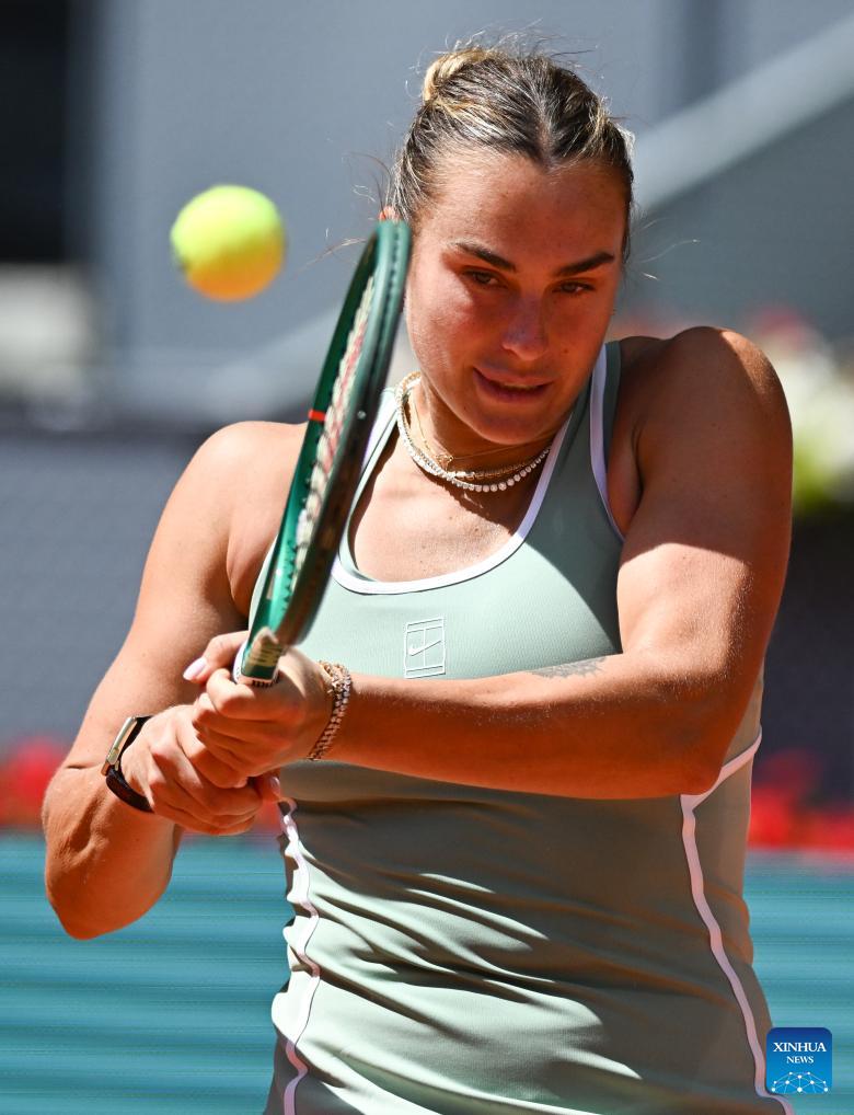 Aryna Sabalenka of Belarus hits a return during the women's singles round of 16 match between Aryna Sabalenka of Belarus and Osaka Naomi of Japan at the 2026 Madrid Open tennis tournament in Madrid, Spain, on April 27, 2026. (Xinhua/Cheng Min)