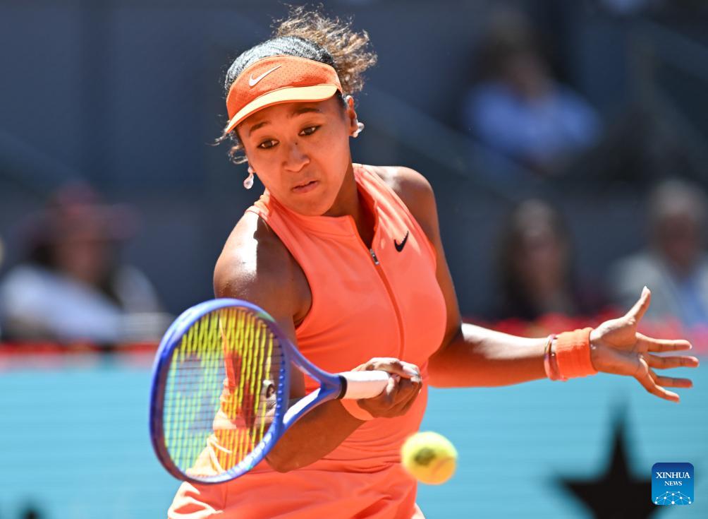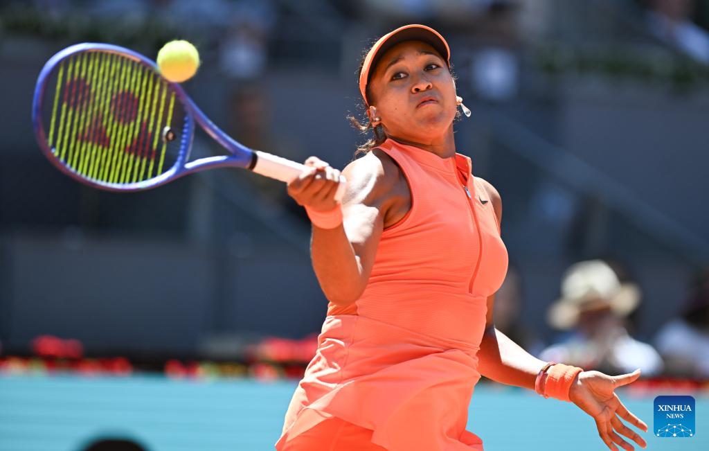 Osaka Naomi of Japan hits a return during the women's singles round of 16 match between Aryna Sabalenka of Belarus and Osaka Naomi of Japan at the 2026 Madrid Open tennis tournament in Madrid, Spain, on April 27, 2026. (Xinhua/Cheng Min)