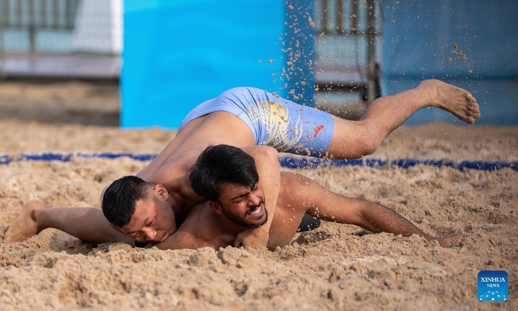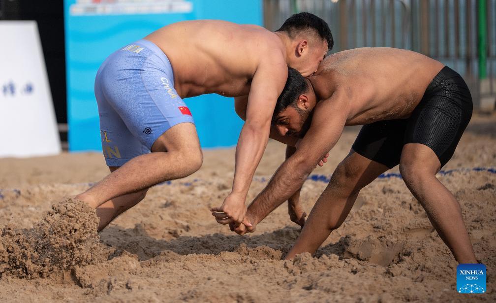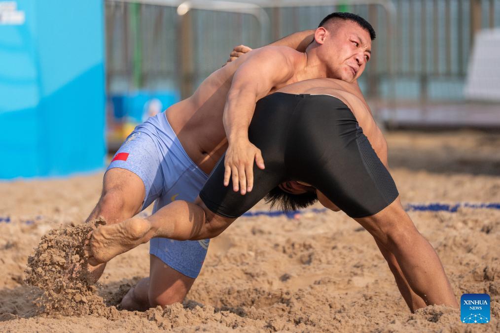 Li Peilong (L) of China competes with Khaled Alalialrefaei of Syria during their beach wrestling men's 90kg round group B match at the 6th Asian Beach Games in Sanya, south China's Hainan Province, April 28, 2026. (Xinhua/Hu Jingwen)