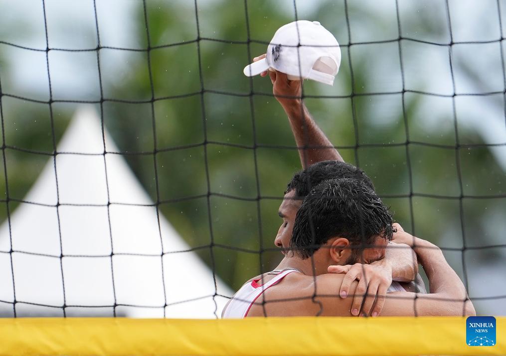 Abolhassan Khakizadeh (R)/Amir Ali Ghalehnovi of Iran celebrate after the beach volleyball men's semifinal match between Abolhassan Khakizadeh/Amir Ali Ghalehnovi of Iran and Hood Rashid Said Ali Al Jalaboubi/Mazin Sulaiman Zahran Al Hashimi of Oman at the 6th Asian Beach Games in Sanya, south China's Hainan Province, April 28, 2026. (Xinhua/Xu Bingjie)