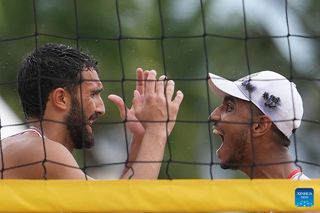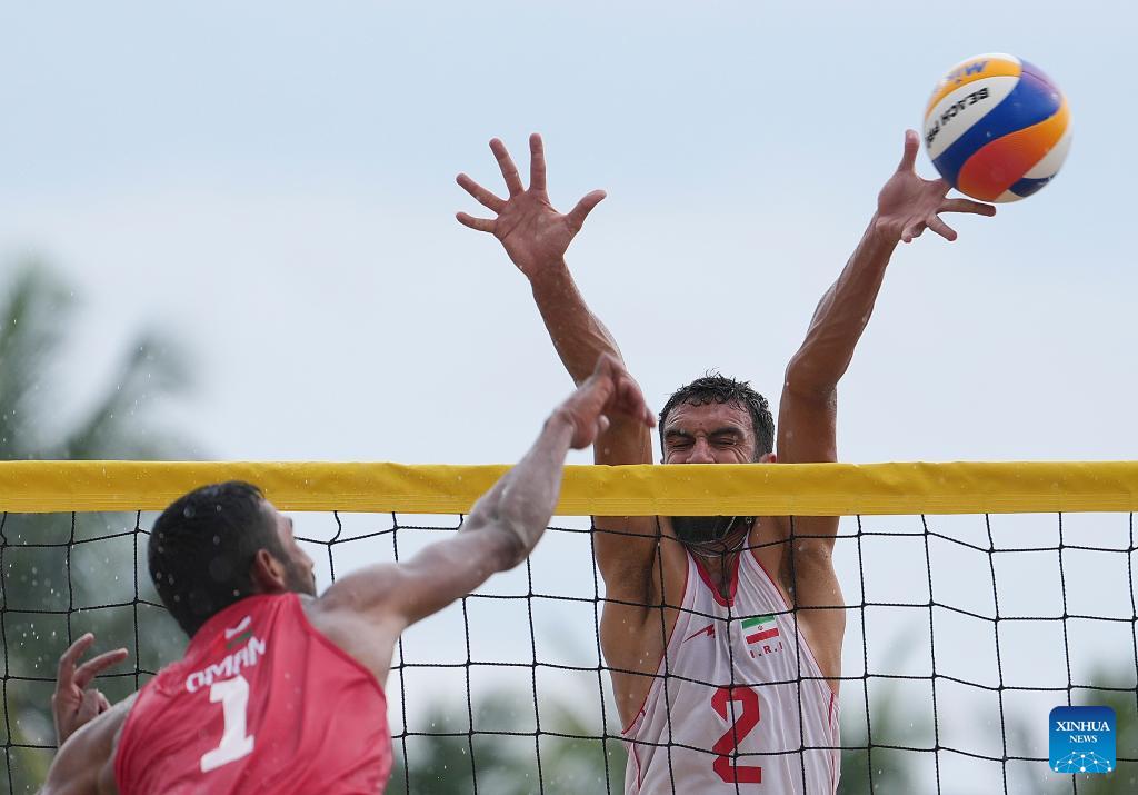 Hood Rashid Said Ali Al Jalaboubi (R) of Oman competes during the beach volleyball men's semifinal match between Abolhassan Khakizadeh/Amir Ali Ghalehnovi of Iran and Hood Rashid Said Ali Al Jalaboubi/Mazin Sulaiman Zahran Al Hashimi of Oman at the 6th Asian Beach Games in Sanya, south China's Hainan Province, April 28, 2026. (Xinhua/Xu Bingjie)