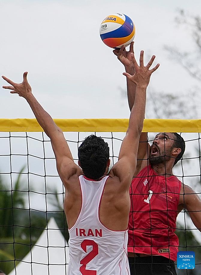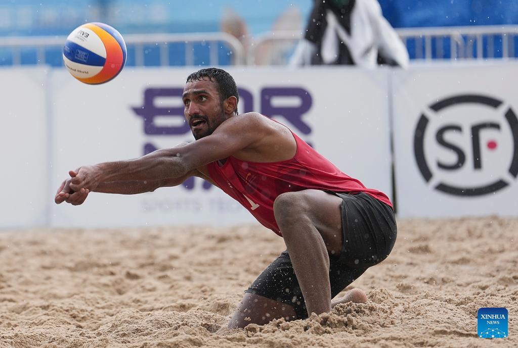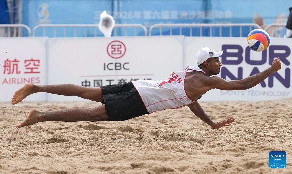 Abolhassan Khakizadeh of Iran competes during the beach volleyball men's semifinal match between Abolhassan Khakizadeh/Amir Ali Ghalehnovi of Iran and Hood Rashid Said Ali Al Jalaboubi/Mazin Sulaiman Zahran Al Hashimi of Oman at the 6th Asian Beach Games in Sanya, south China's Hainan Province, April 28, 2026. (Xinhua/Xu Bingjie)