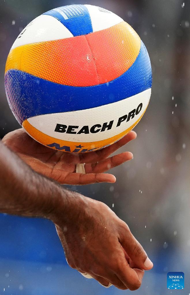 Abolhassan Khakizadeh of Iran is ready to serve during the beach volleyball men's semifinal match between Abolhassan Khakizadeh/Amir Ali Ghalehnovi of Iran and Hood Rashid Said Ali Al Jalaboubi/Mazin Sulaiman Zahran Al Hashimi of Oman at the 6th Asian Beach Games in Sanya, south China's Hainan Province, April 28, 2026. (Xinhua/Xu Bingjie)