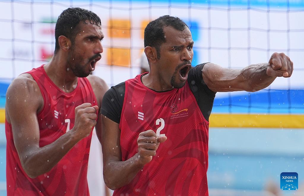 Hood Rashid Said Ali Al Jalaboubi (L)/Mazin Sulaiman Zahran Al Hashimi of Oman react during the beach volleyball men's semifinal match between Abolhassan Khakizadeh/Amir Ali Ghalehnovi of Iran and Hood Rashid Said Ali Al Jalaboubi/Mazin Sulaiman Zahran Al Hashimi of Oman at the 6th Asian Beach Games in Sanya, south China's Hainan Province, April 28, 2026. (Xinhua/Xu Bingjie)