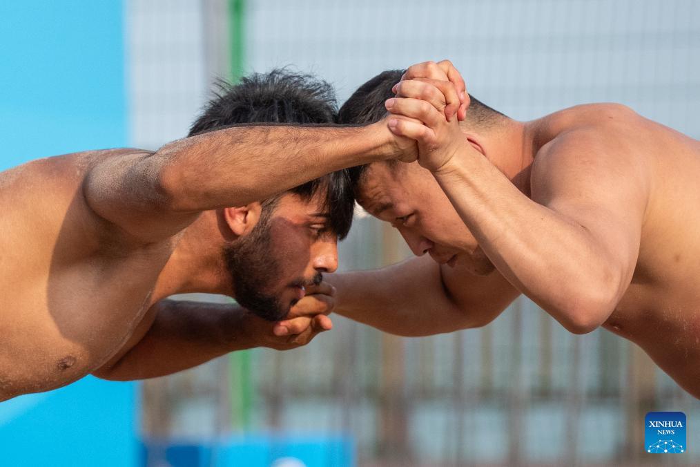 Li Peilong (R) of China competes with Khaled Alalialrefaei of Syria during their beach wrestling men's 90kg round group B match at the 6th Asian Beach Games in Sanya, south China's Hainan Province, April 28, 2026. (Xinhua/Hu Jingwen)