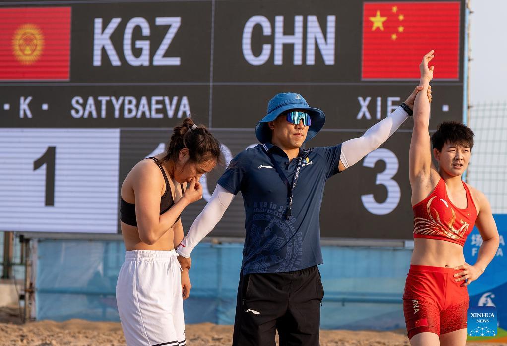 Xie Mengyu (R) of China is declared the winner of the beach wrestling women's 60kg round group C match against Akylai Kutbolsunovna Satybaeva of Kyrgyzstan at the 6th Asian Beach Games in Sanya, south China's Hainan Province, April 28, 2026. (Xinhua/Hu Jingwen)