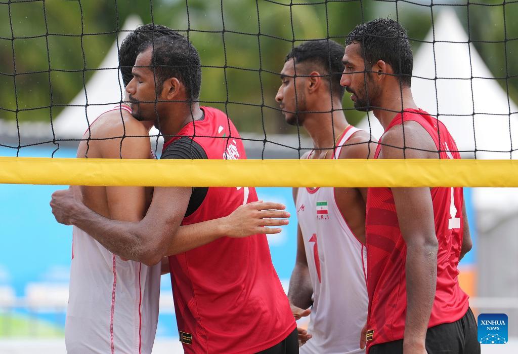Players of both sides greet each other after the beach volleyball men's semifinal match between Abolhassan Khakizadeh/Amir Ali Ghalehnovi of Iran and Hood Rashid Said Ali Al Jalaboubi/Mazin Sulaiman Zahran Al Hashimi of Oman at the 6th Asian Beach Games in Sanya, south China's Hainan Province, April 28, 2026. (Xinhua/Xu Bingjie)