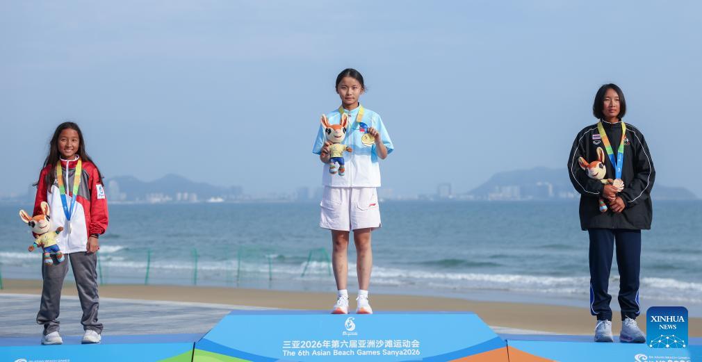 Gold medalist Cheng Wenyu (C) of China, silver medalist Zahedi Anya Alessia (L) of Singapore and bronze medalist Pariyaporn Chantarawong of Thailand pose during the awarding ceremony for the Optimist Girls race of sailing at the 6th Asian Beach Games in Sanya, south China's Hainan Province, April 28, 2026. (Photo: Xinhua)
