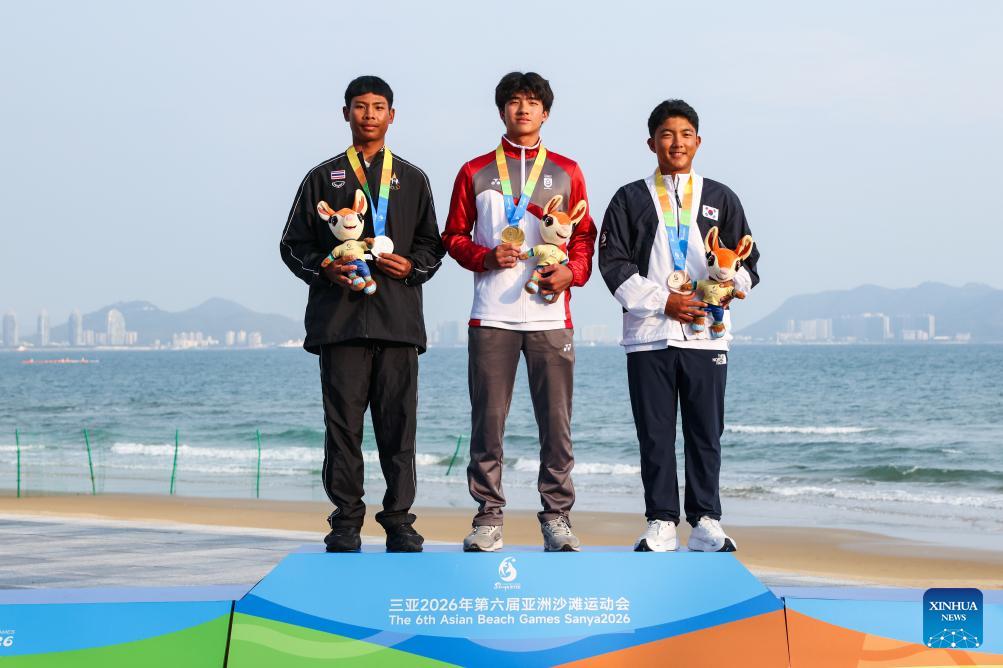 Gold medalist Goh Ian (C) of Singpore, silver medalist Hussaluk Srinakorn (L) of Thailand and bronze medalist Choi Jiun of South Korea attend the awarding ceremony for the ILCA4 Boys race of sailing at the 6th Asian Beach Games in Sanya, south China's Hainan Province, April 28, 2026. (Xinhua/Zhang Fan)