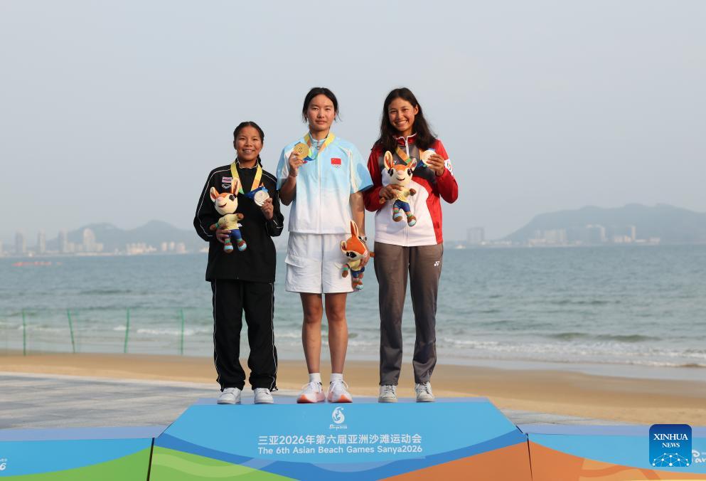 Gold medalist Yan Guoguo (C) of China, silver Medalist Pailin Jaroenpon (L) of Thailand and bronze medalist Nia Mehry Zahedi of Singapore attend the awarding ceremony for the ILCA4 Girls race of sailing at the 6th Asian Beach Games in Sanya, south China's Hainan Province, April 28, 2026. (Xinhua/Zhang Fan)