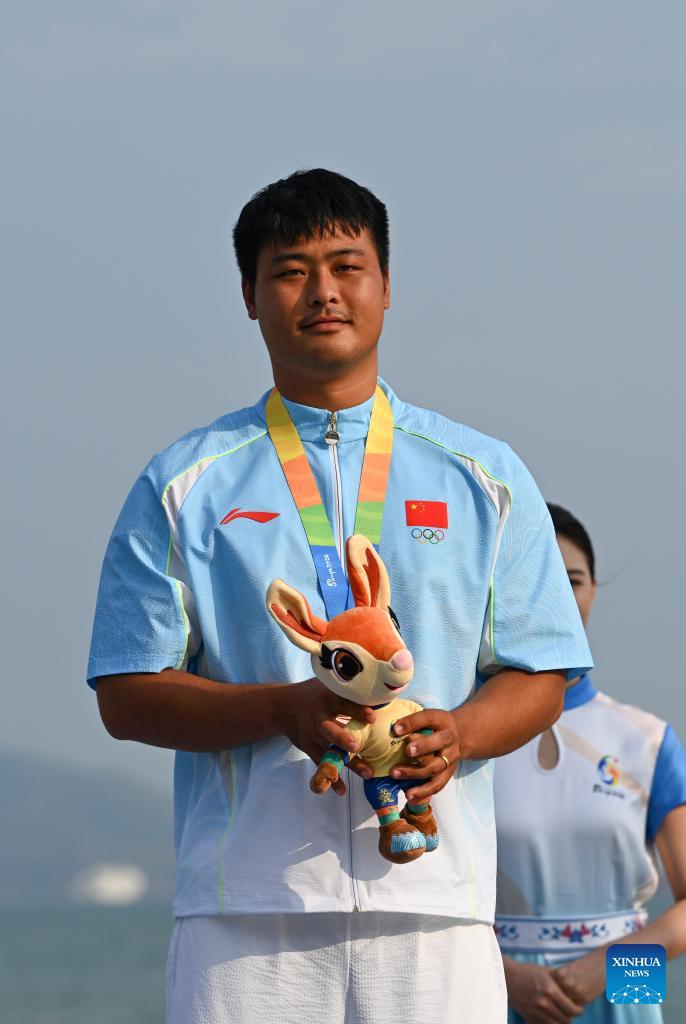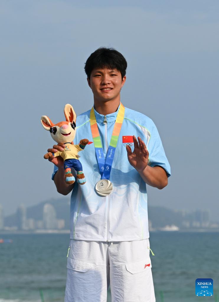 Silver medalist Xue Shiming of China poses during the awarding ceremony for the Formula Kite Men race of sailing at the 6th Asian Beach Games in Sanya, south China's Hainan Province, April 28, 2026. (Xinhua/Wei Hai)