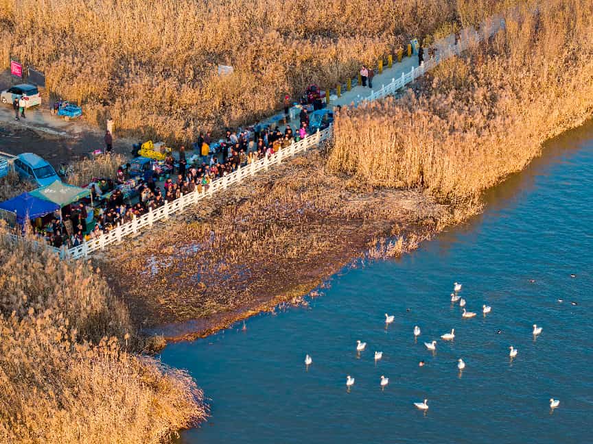 Tourists watch swans at a wetland in Dachuan township, Xigu district, Lanzhou, northwest China's Gansu province, Dec. 7, 2025. (Photo: Wang Hong)
