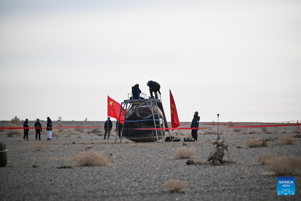 The return capsule of the Shenzhou-20 spaceship, carrying no astronauts, touched down at the Dongfeng landing site in north China's Inner Mongolia Autonomous Region on Monday, bringing back a valuable retired extravehicular spacesuit as part of its return cargo.