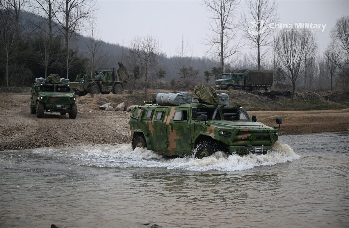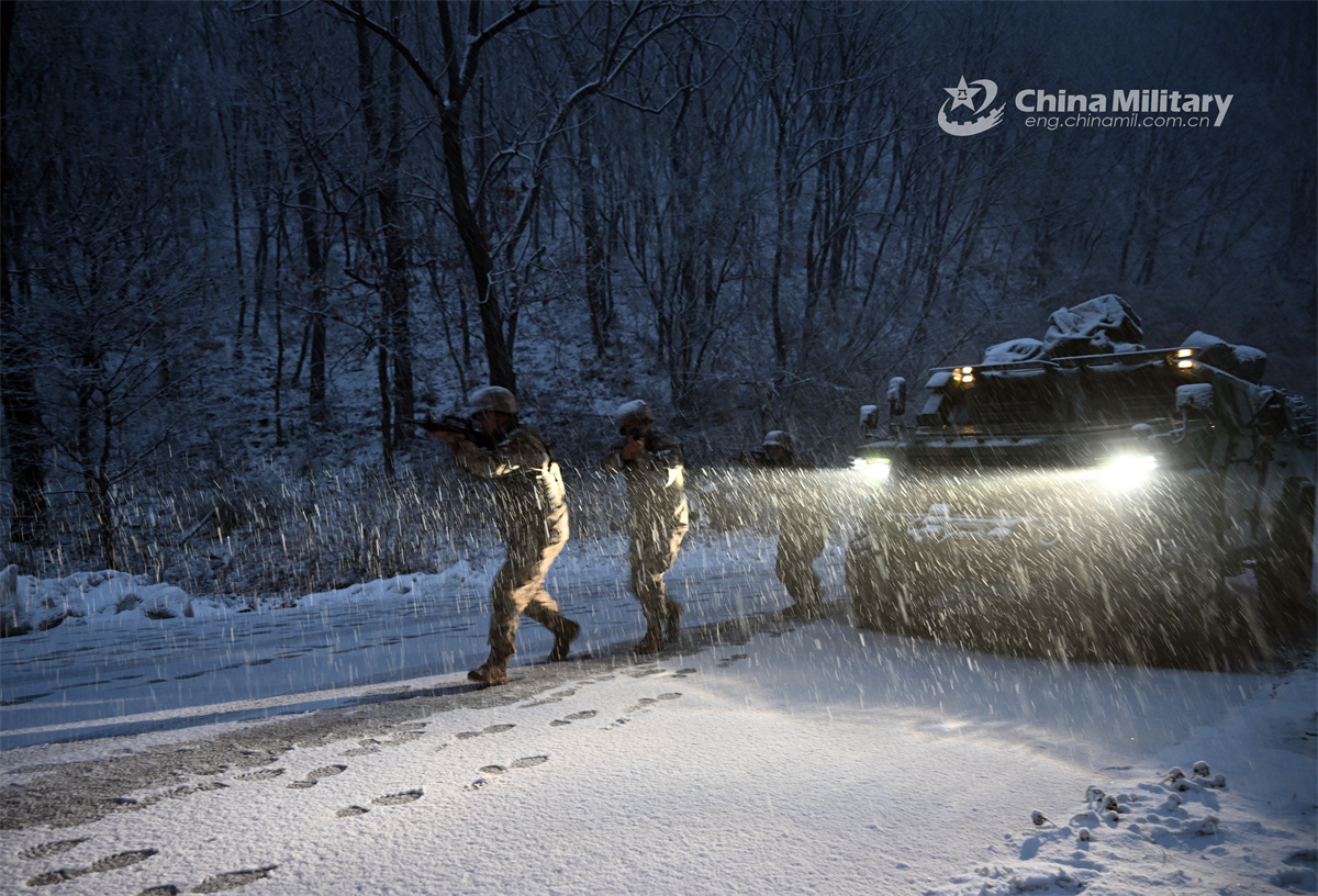 Soldiers assigned to a brigade under the Chinese PLA 82nd Group Army advance in combat formation under the cover of a Dongfeng Mengshi off-road armored assault vehicle during a training exercise on January 29, 2026. (eng.chinamil.com.cn/Photo by Mu Ruilin)