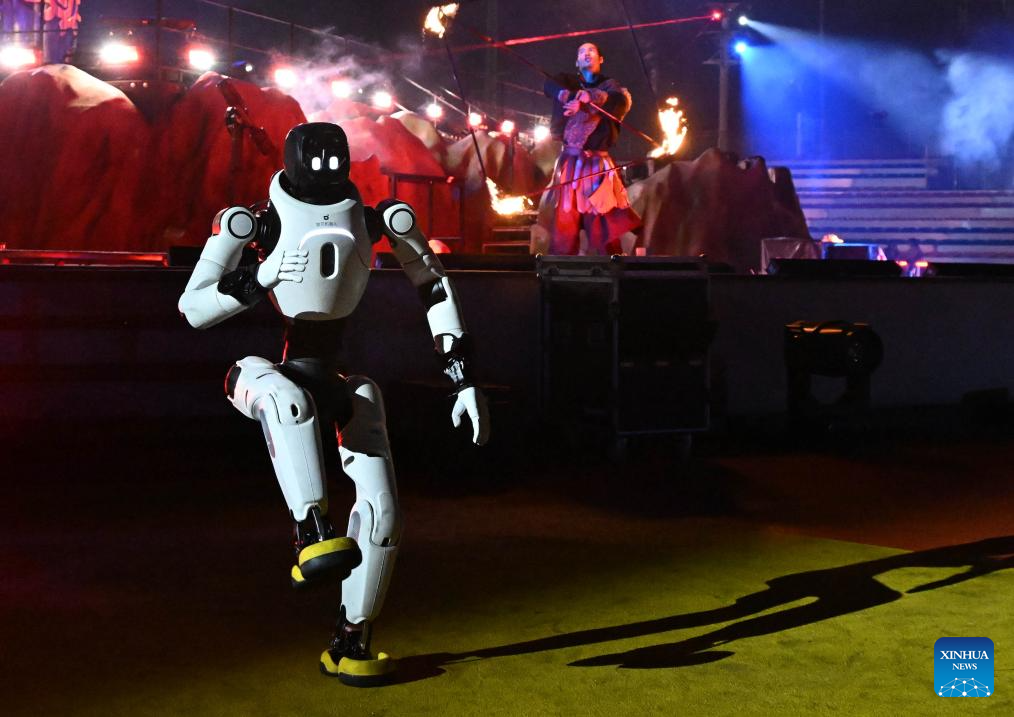 A humanoid robot performs during a myth-themed live-action show at a scenic area in Qingdao, east China's Shandong Province, on Feb. 26, 2026. (Xinhua/Li Ziheng)