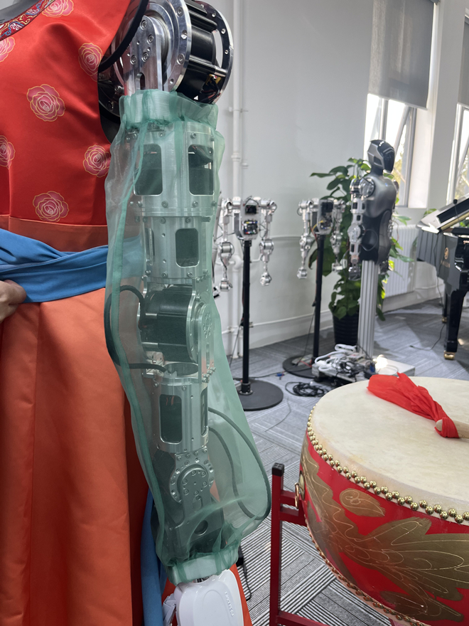 The robot band performing at the forum had to move their arms frequently while playing instruments, so the designers took inspiration from the Tang Dynasty (618-907) short-sleeved ruqun, a type of Hanfu. Its compact cut allows easy movement. The patterns were inspired by Beijing's city flower, the Chinese rose.