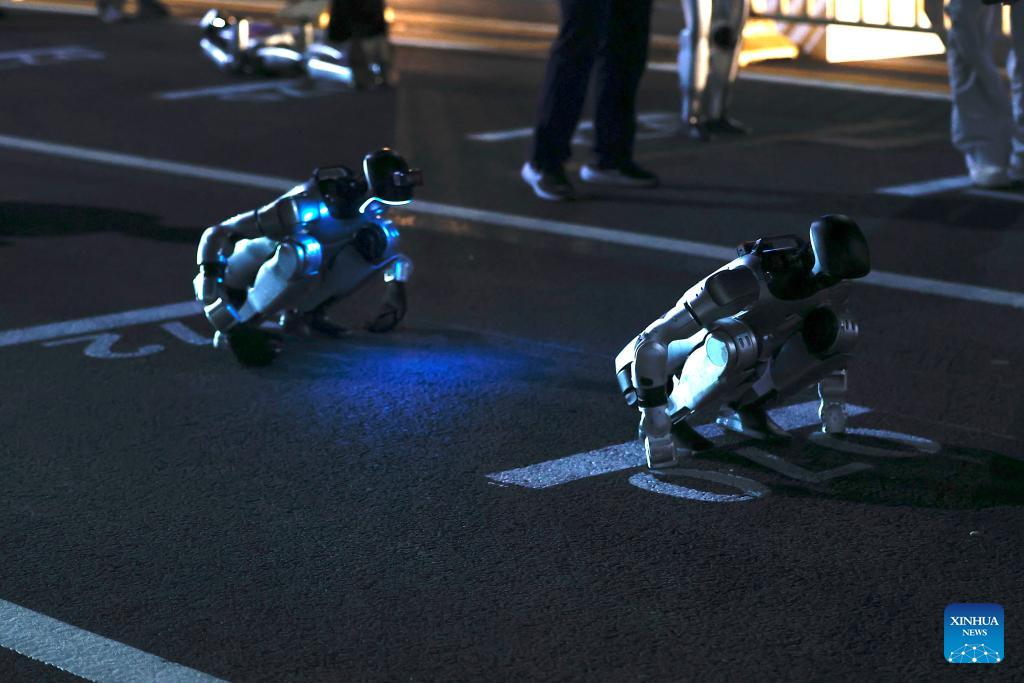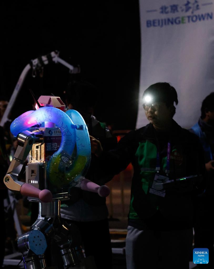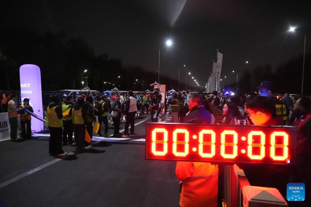 Teams prepare at the start area before the test activity for the 2026 Beijing E-Town Humanoid Robot Half Marathon on April 11, 2026. A full-process and comprehensive testing activity for the Beijing E-Town humanoid robot half-marathon, scheduled for April 19, 2026, was carried out from Saturday night to early Sunday morning. (Xinhua/Xie Han)