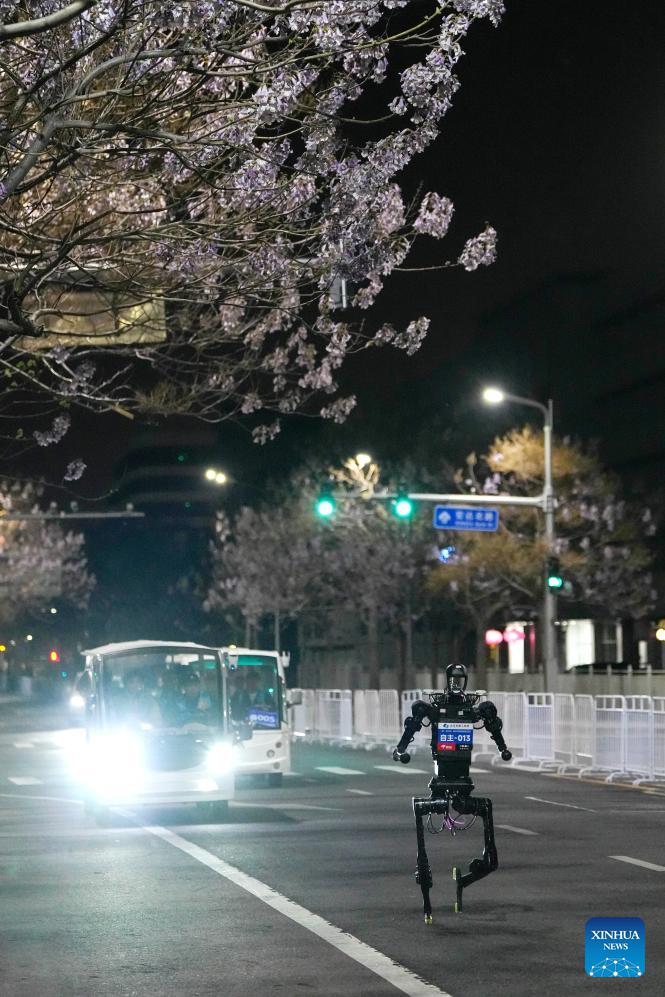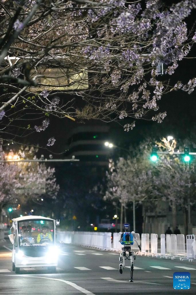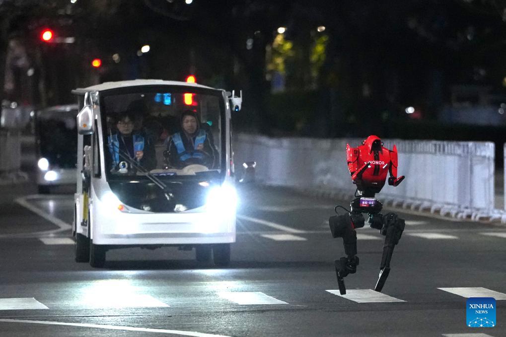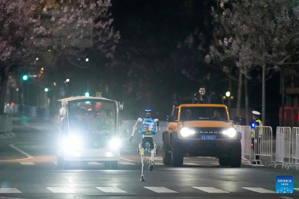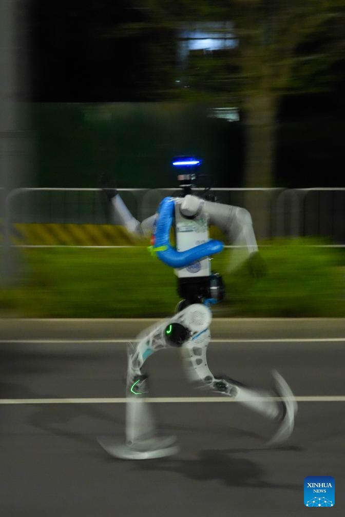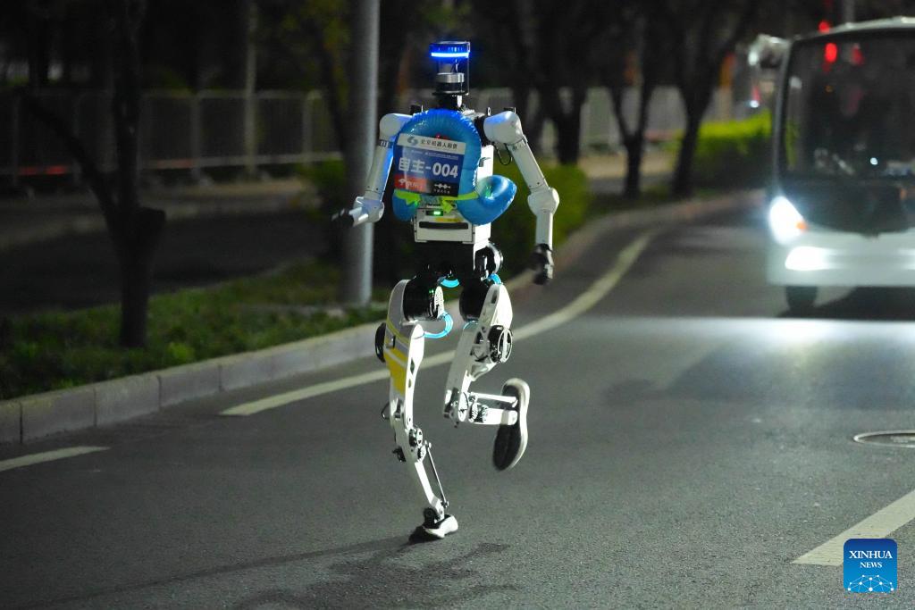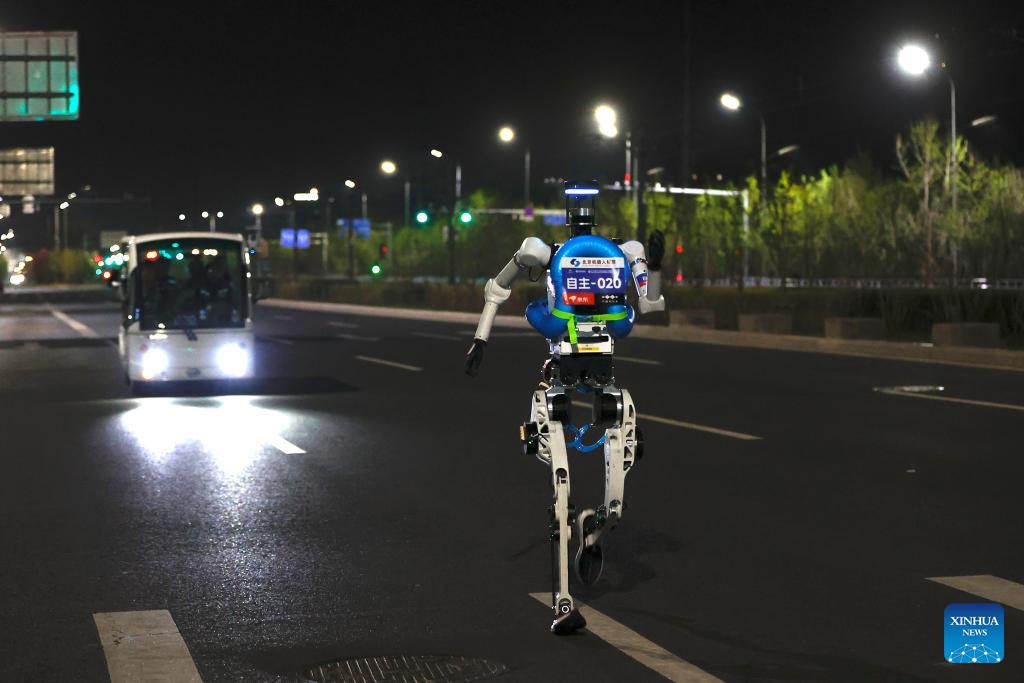 A humanoid robot runs during the test activity for the 2026 Beijing E-Town Humanoid Robot Half Marathon on April 11, 2026. A full-process and comprehensive testing activity for the Beijing E-Town humanoid robot half-marathon, scheduled for April 19, 2026, was carried out from Saturday night to early Sunday morning. (Xinhua/Xie Han)