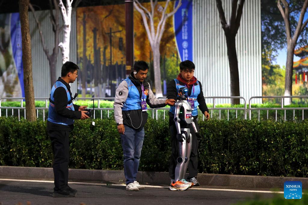 An engineer and a humanoid robot from the remote control team are seen at the start area before the test activity for the 2026 Beijing E-Town Humanoid Robot Half Marathon on April 11, 2026. A full-process and comprehensive testing activity for the Beijing E-Town humanoid robot half-marathon, scheduled for April 19, 2026, was carried out from Saturday night to early Sunday morning. (Xinhua/Wang Lili)