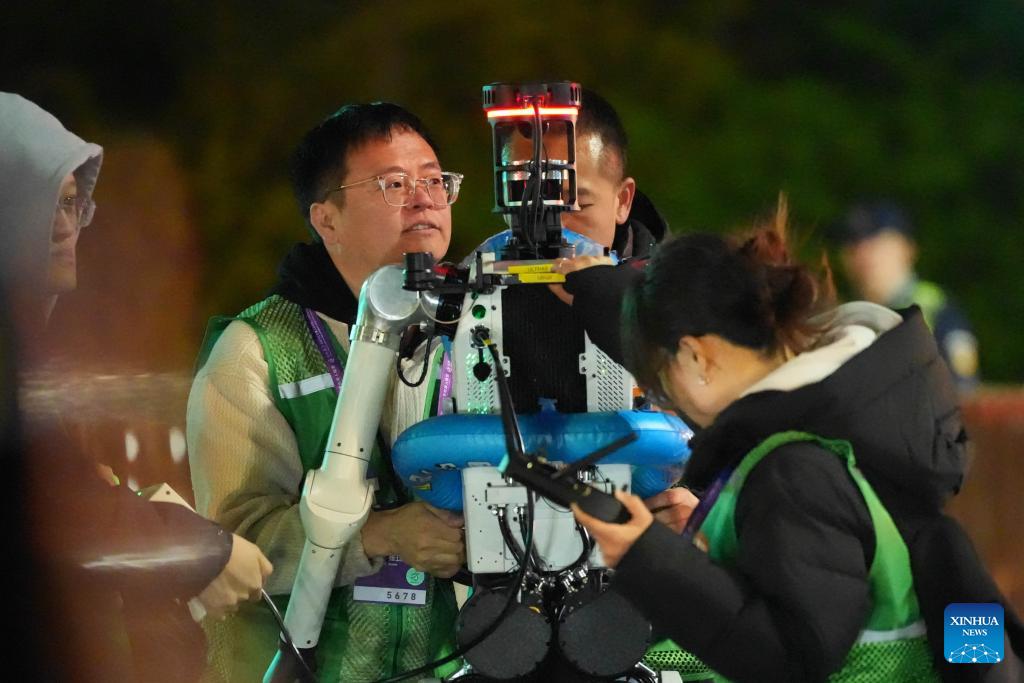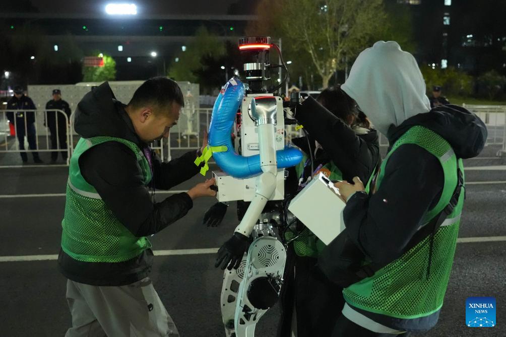 Engineers works on a humanoid robot during the test activity for the 2026 Beijing E-Town Humanoid Robot Half Marathon on April 12, 2026. A full-process and comprehensive testing activity for the Beijing E-Town humanoid robot half-marathon, scheduled for April 19, 2026, was carried out from Saturday night to early Sunday morning. (Photo by Zhai Yifan/Xinhua)