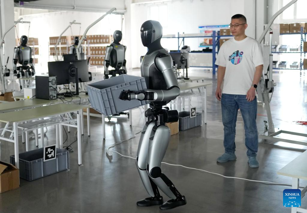 A staff member of an intelligent robot industrial base debugs a robot in Haigang District of Qinhuangdao, north China's Hebei Province, April 28, 2026. Local authorities in Haigang District has set up an innovation platform and introduced tailored policies to encourage enterprises in robot industry to increase their investment in research and development, thereby advancing the upgrade of products covering a wide range. (Xinhua/Yang Shiyao)