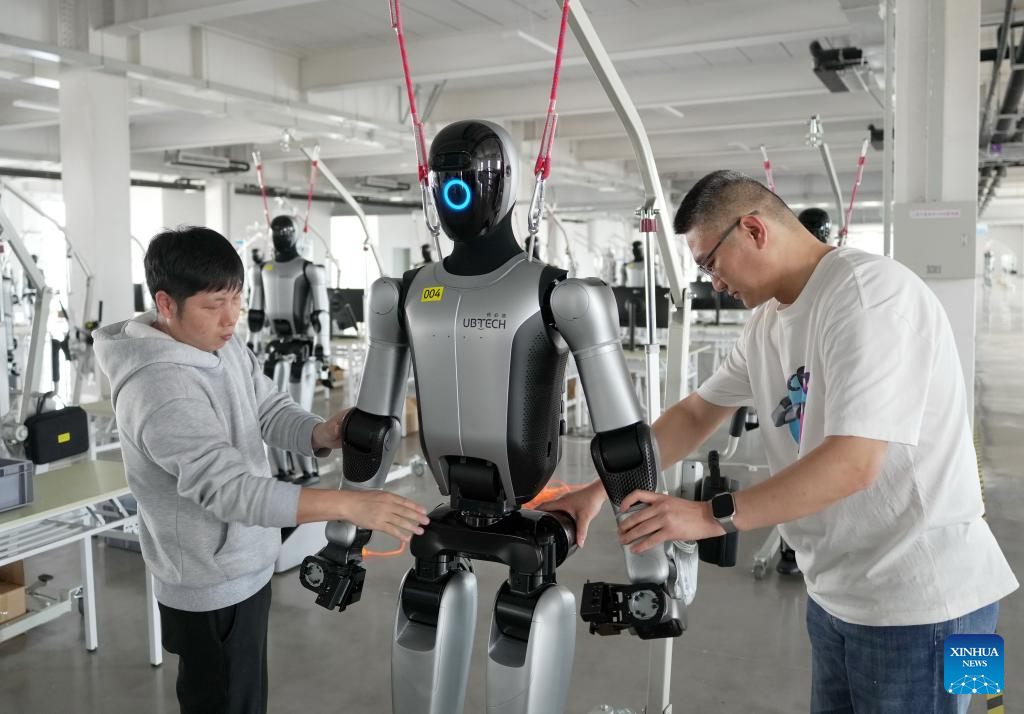 Staff members of an intelligent robot industrial base debug a robot in Haigang District of Qinhuangdao, north China's Hebei Province, April 28, 2026. Local authorities in Haigang District has set up an innovation platform and introduced tailored policies to encourage enterprises in robot industry to increase their investment in research and development, thereby advancing the upgrade of products covering a wide range. (Xinhua/Yang Shiyao)