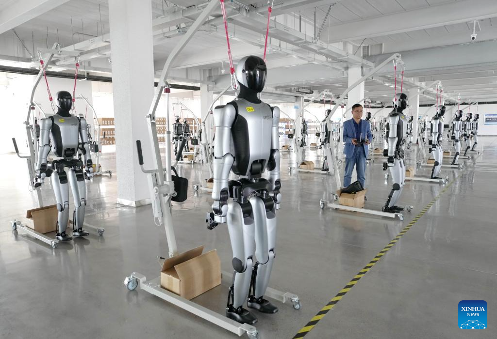 A staff member of an intelligent robot industrial base debugs robots in Haigang District of Qinhuangdao, north China's Hebei Province, April 28, 2026. Local authorities in Haigang District has set up an innovation platform and introduced tailored policies to encourage enterprises in robot industry to increase their investment in research and development, thereby advancing the upgrade of products covering a wide range. (Xinhua/Yang Shiyao)