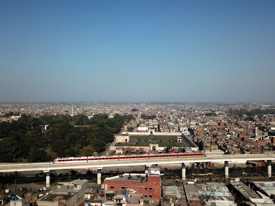 An aerial drone photo taken on Feb. 2, 2024 shows an Orange Line Metro Train (OLMT) running on the track in Lahore, Pakistan. (Photo: Xinhua)
