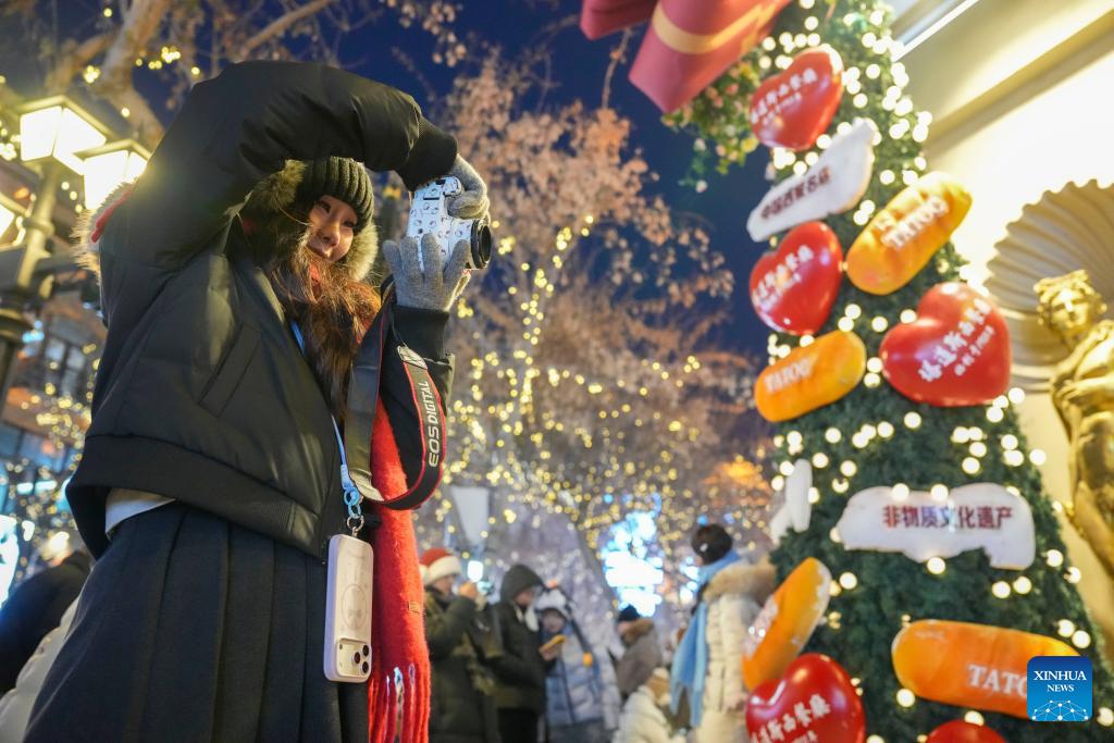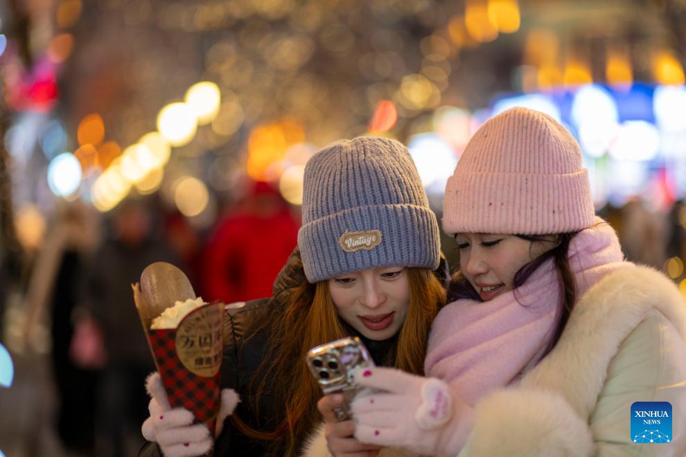 People watch photos taken by a cellphone on the Central Street in Harbin, northeast China's Heilongjiang Province, Jan. 12, 2026. As one of the most popular attractions in Harbin, the Central Street, which is renowned for its diverse European-style architecture, wows tourists with its colorful lights at night during the city's tourism boom this winter. (Xinhua/Zhang Tao)