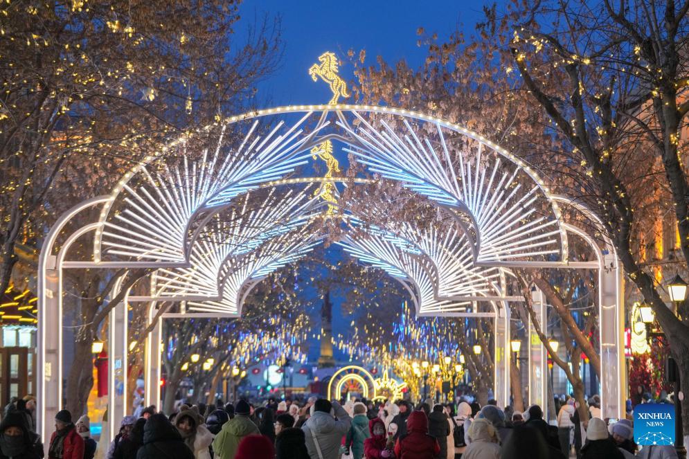 People visit the Central Street in Harbin, northeast China's Heilongjiang Province, Jan. 12, 2026. As one of the most popular attractions in Harbin, the Central Street, which is renowned for its diverse European-style architecture, wows tourists with its colorful lights at night during the city's tourism boom this winter. (Xinhua/Zhang Tao)