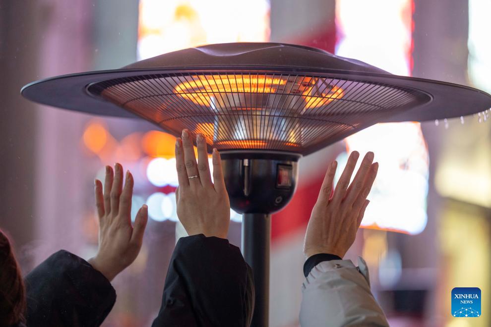 People get warmth from a warm light on the Central Street in Harbin, northeast China's Heilongjiang Province, Jan. 12, 2026. As one of the most popular attractions in Harbin, the Central Street, which is renowned for its diverse European-style architecture, wows tourists with its colorful lights at night during the city's tourism boom this winter. (Xinhua/Zhang Tao)