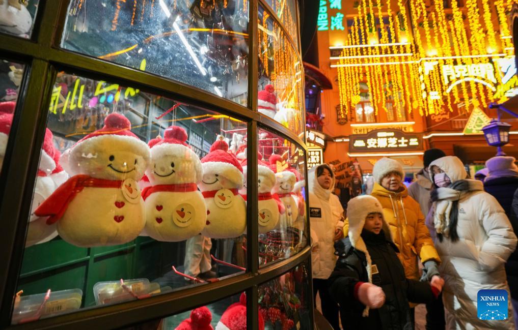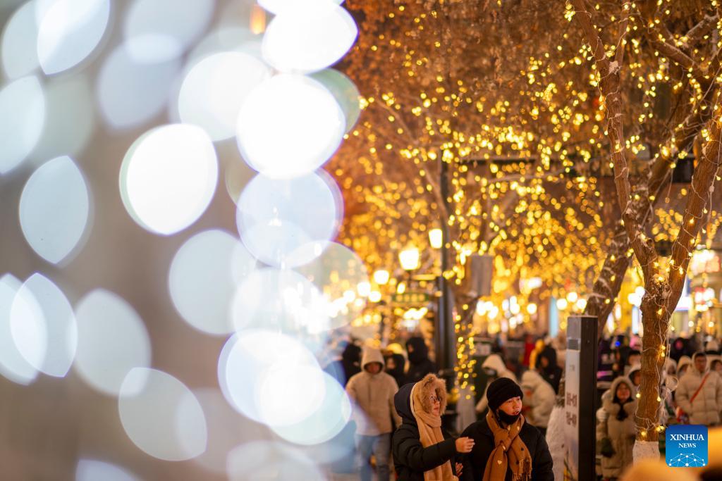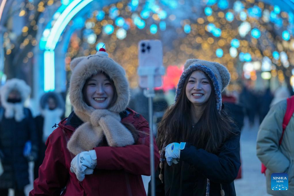People have fun on the Central Street in Harbin, northeast China's Heilongjiang Province, Jan. 11, 2026. As one of the most popular attractions in Harbin, the Central Street, which is renowned for its diverse European-style architecture, wows tourists with its colorful lights at night during the city's tourism boom this winter. (Xinhua/Wang Jianwei)