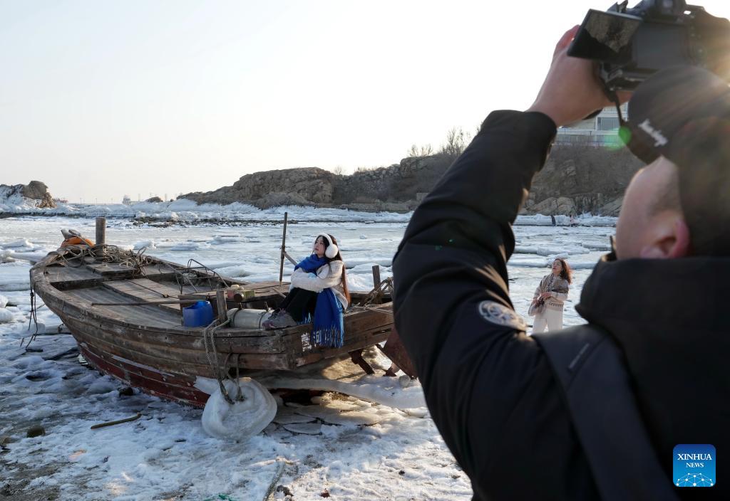 A tourist takes photos at a beach covered with sea ice in Beidaihe District of Qinhuangdao, north China's Hebei Province, on Jan. 31, 2026. (Xinhua/Yang Shiyao)