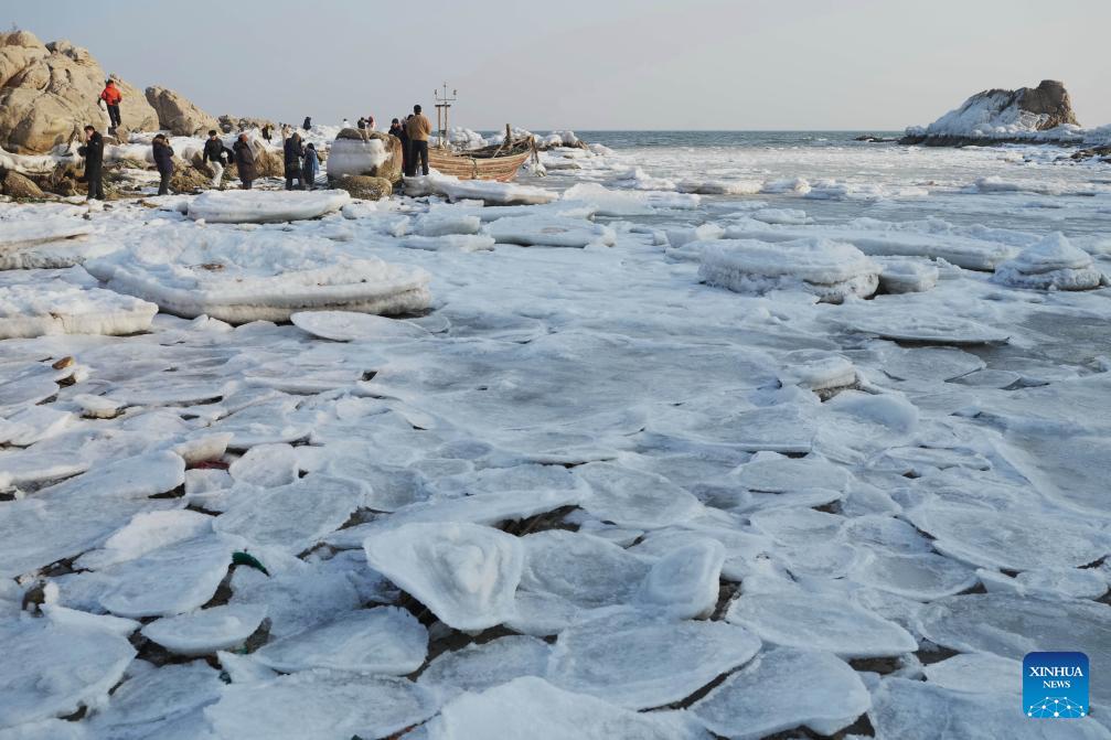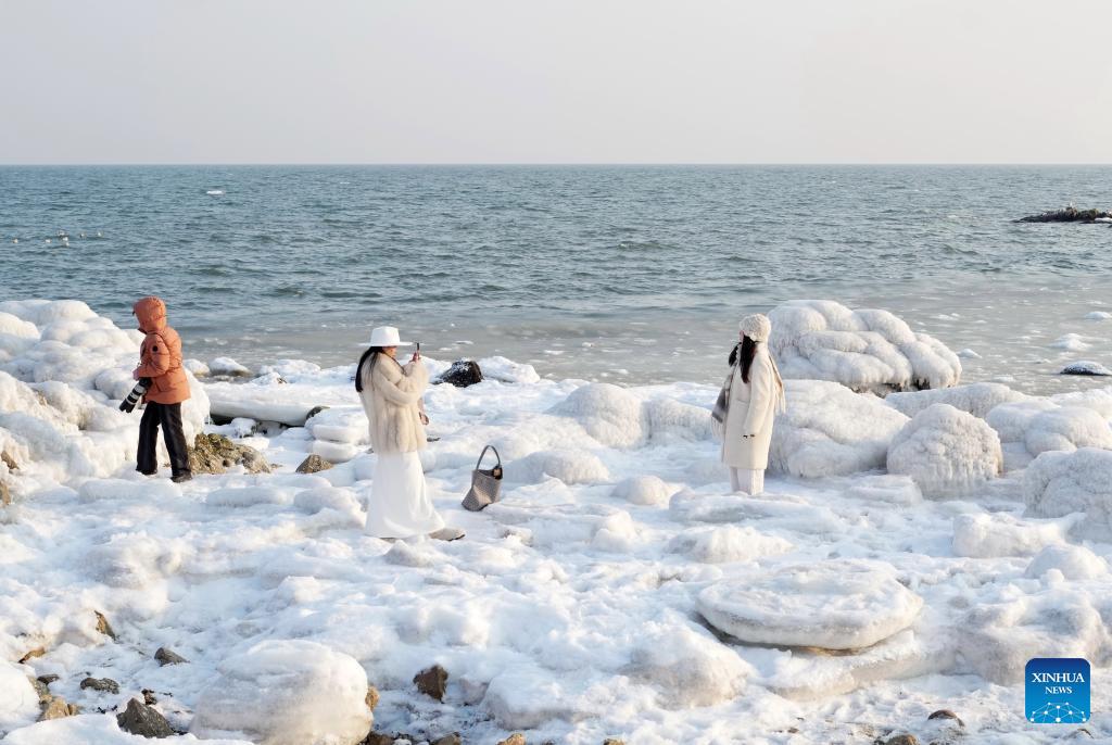 Tourists visit a beach covered with sea ice in Beidaihe District of Qinhuangdao, north China's Hebei Province, on Jan. 31, 2026. (Xinhua/Yang Shiyao)